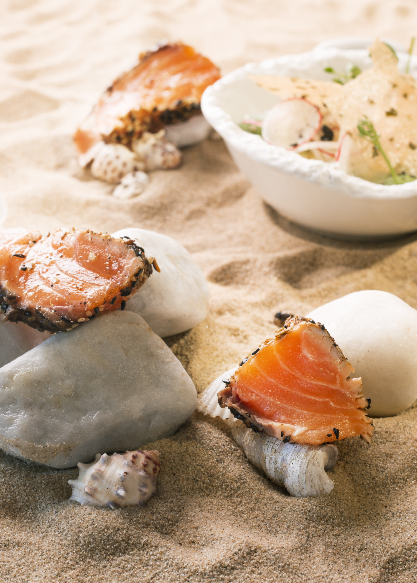 Dominique en Lauren leerden elkaar kennen in Spanje aan de Middelandse zee. In 2015 starten ze Puur, hun restaurant in Turnhout. Hier proberen ze het zalige vakantiegevoel dat ze toen in Spanje hadden bij jou op tafel te bezorgen. Ik vond het zo een prachtig concept en ging dus meteen aan het brainstormen om dit concept ook in de foto's weer te geven. Zo kocht ik me een zak zand en verzamelde ik stenen die hier perfect bijpassen. Dominique en ik kwamen op het idee om de zalm op de stenen te leggen. Door de juiste plaatsing van mijn licht lijkt het alsof de zon wel op de zalm lijkt te schijnen en je je in Spanje bevind.